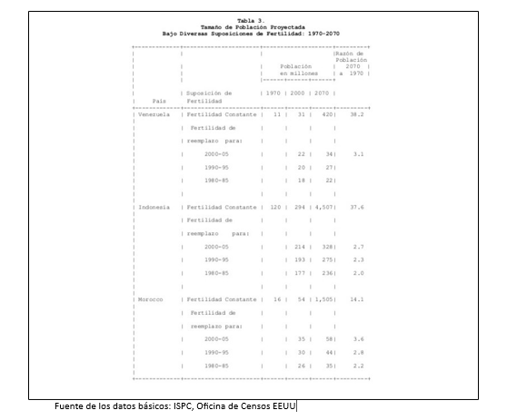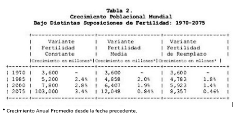 Las estimaciones de las Naciones Unidas utilizan la población de 1970 de 3.600 millones como base (hay casi 4 mil millones ahora) y proyectan entre 6 y 8 mil millones de personas para el año 2000 con una estimación media de los EEUU de 6.400 millones. Las proyecciones medias de los EEUU muestran una población mundial de 12.000 millones para el año 2075 lo que implica un incremento de 5 veces en el Sudeste de Asia y América Latina y un incremento de 7 veces en África, comparado con incremento de 2 veces en el Este de Asia y un incremento del 40% en los países desarrollados (ver Tabla 1). La mayoría de los demógrafos, incluyendo los Consejos de Población de las Naciones Unidas y de los Estados Unidos creen que 10 a 13 mil millones es el nivel más probable de estabilidad poblacional mundial, aun con esfuerzos intensivos en control de fertilidad. (Estas proyecciones asumen que suficientes alimentos pueden ser producidos y distribuidos para evitar limitaciones causadas por hambrunas.)